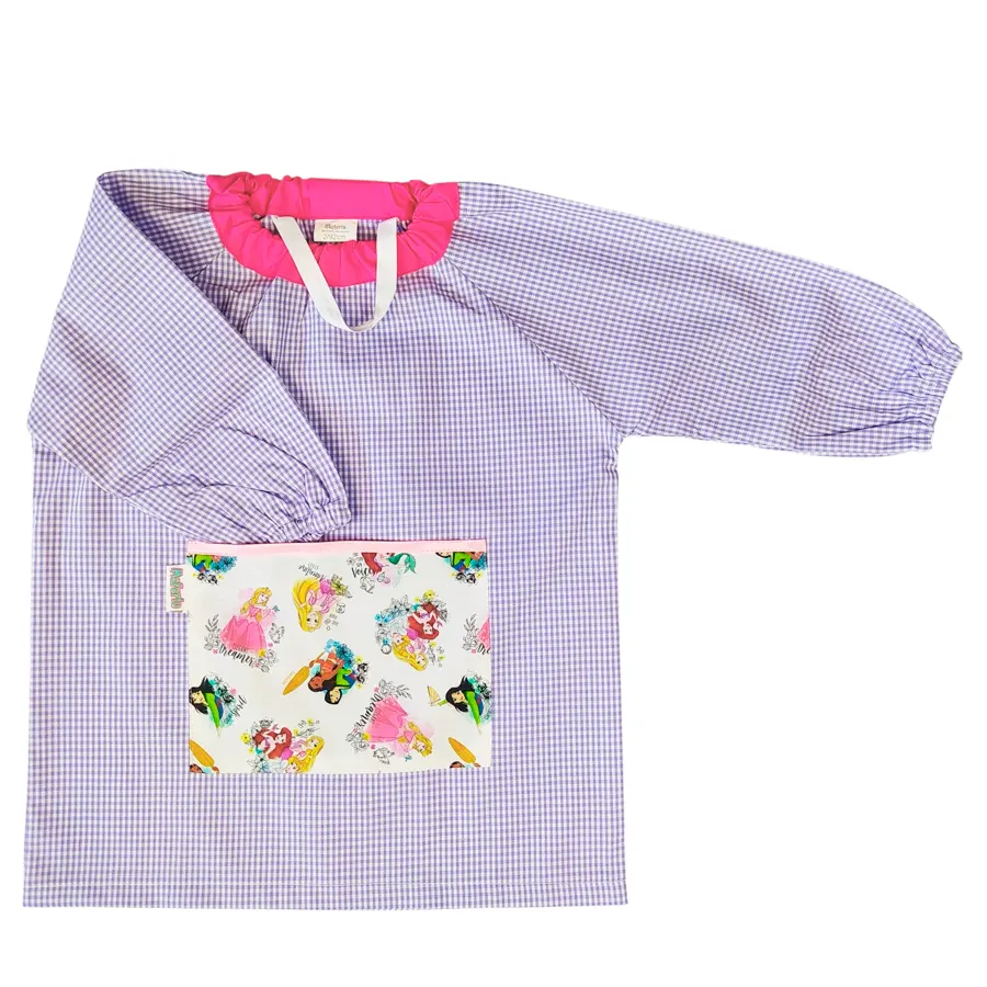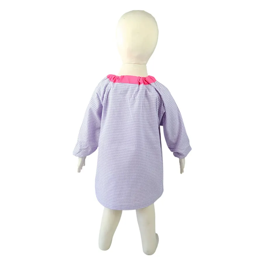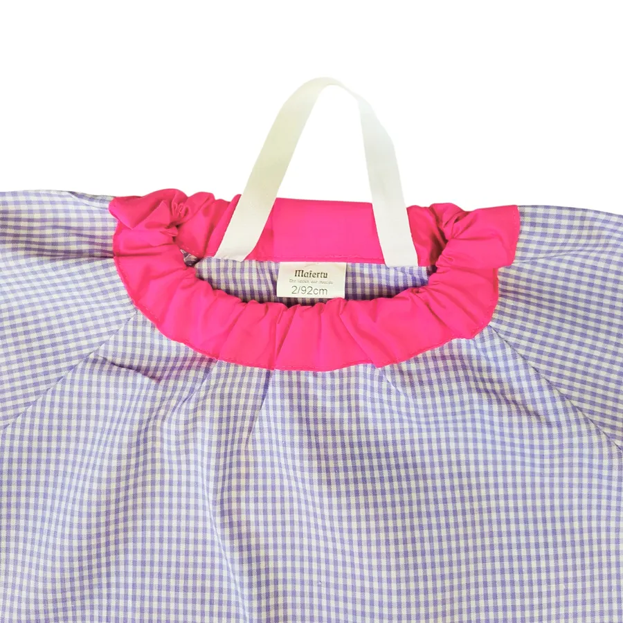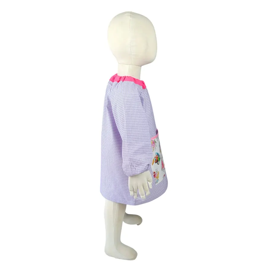 La prenda está confeccionada con tela vichy a cuadros lilas y blancos de 50% poliéster y 50% algodón de alta calidad y muy resistente. La tela del estampado para hacer el bolsillo es 100% algodón, al igual que los ribetes. El género es de doble hilatura para que así no calen fácilmente los líquidos. Incluye una beta de 20 cm cosida en el cuello que permite colgarla en el aula con total autonomía.