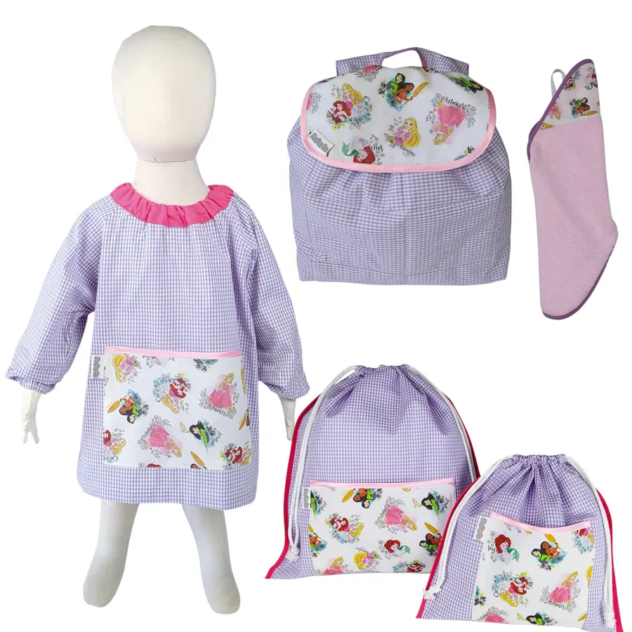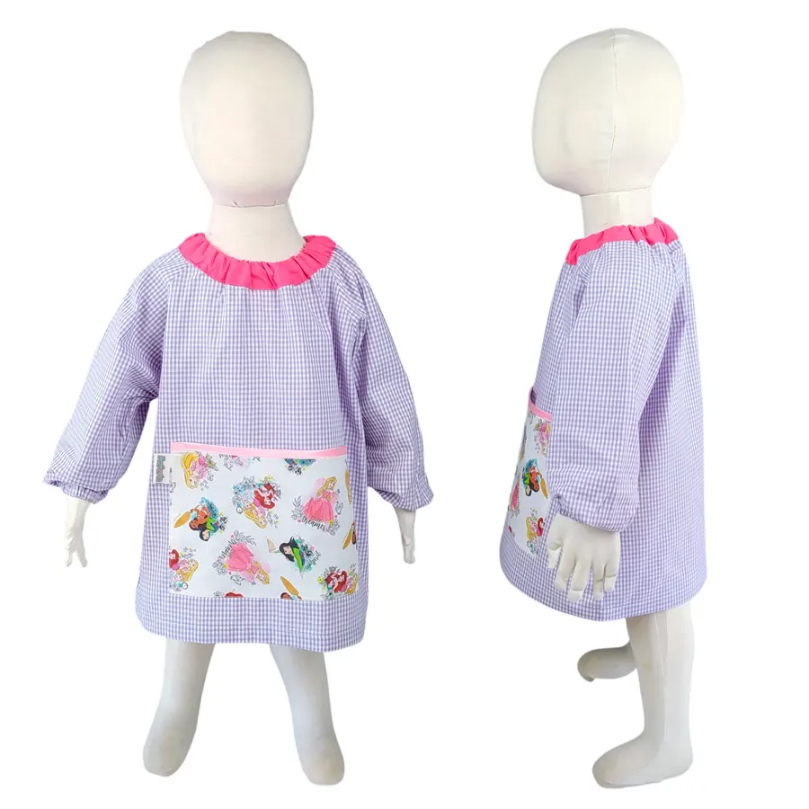 La disponibilidad de tallas para esta bata escolar botones princesas es hasta los 6 años. Si deseas una bata de estas características más grande, la podemos realizar por encargo.