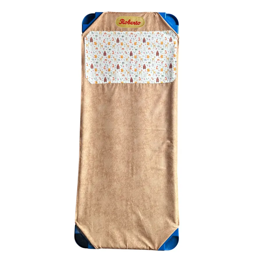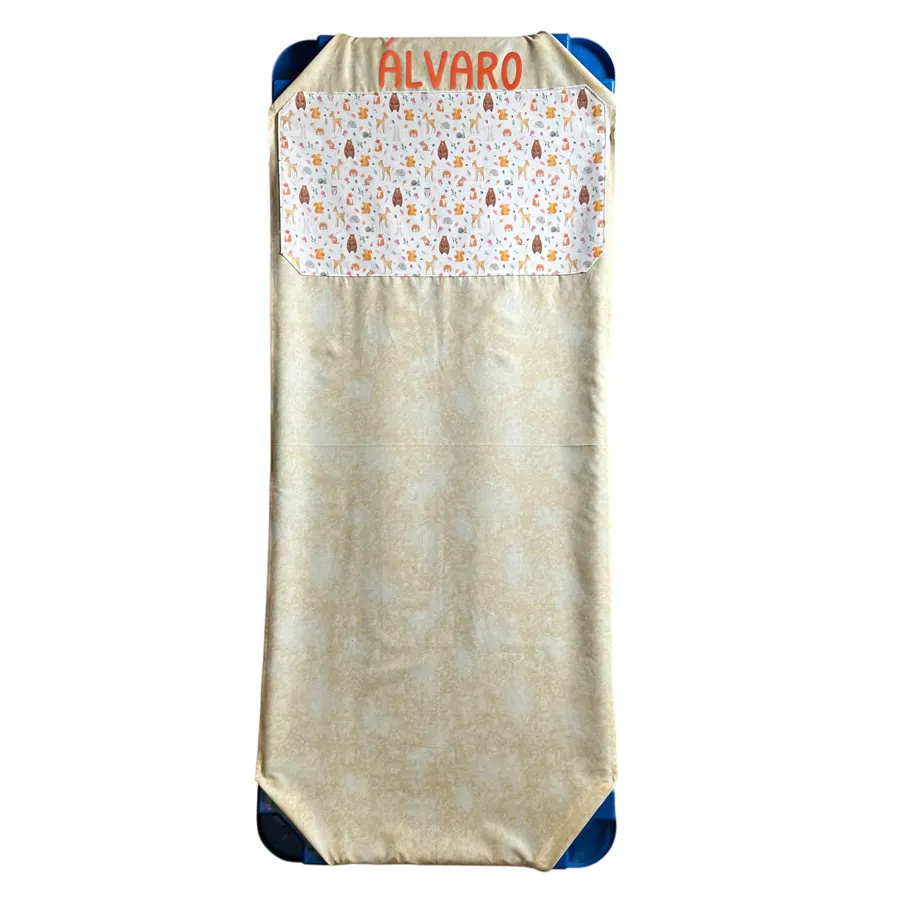 Sábana hamaca guardería animales especialmente diseñada para utilizar en una tumbona como ropa de cama para las hamacas apilables que tienen en muchos colegios. Tiene gomas en las esquinas para poder ajustarla a la perfección sin que se desplace cuando el niño o niña se mueva durante la siesta. Estas gomas son elásticas y de alta resistencia, asegurando que la sábana permanezca en su lugar y brinde comodidad durante todo el tiempo de descanso.